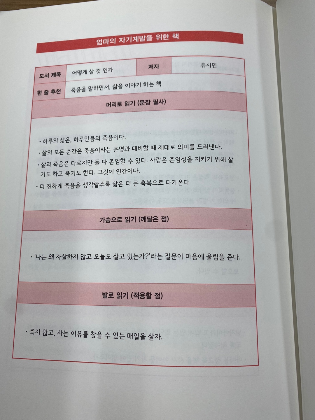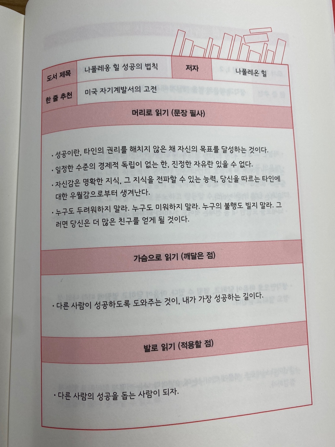 | 머리로 읽기 (문장 필사) | 삶에 변화를 가져오는 머리-가슴-발 독서 책을 읽는 진정한 목적은 실천하기 위해서가 되어야 한다. 한 권의 책을 읽으면 (머리), 반드시 한 가지를 깨닫고(가슴), 한 가지를 실천하자(발) |