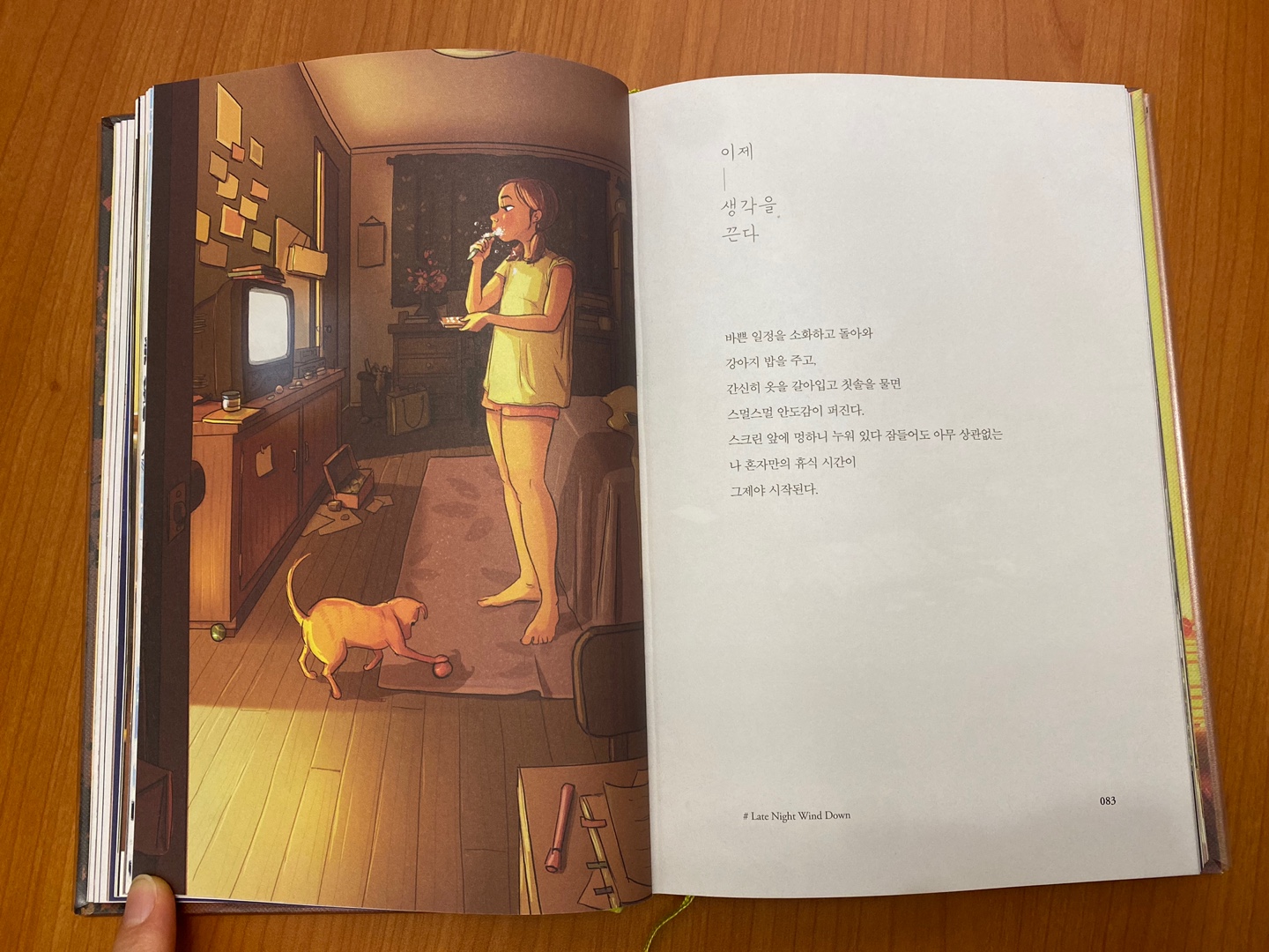 "따사롭고 다정한 그림을 가득 담은 일러스트집은 많지만, 왜 그 행복은 연인, 혹은 부부가 느끼는 것이어야만 할까요. 우리를 가장 깊게 만들어준 순간들, 내 마음을 온전히 만날 수 있었던 시간들은 사실 혼자 보냈던 것 아닐까요?"