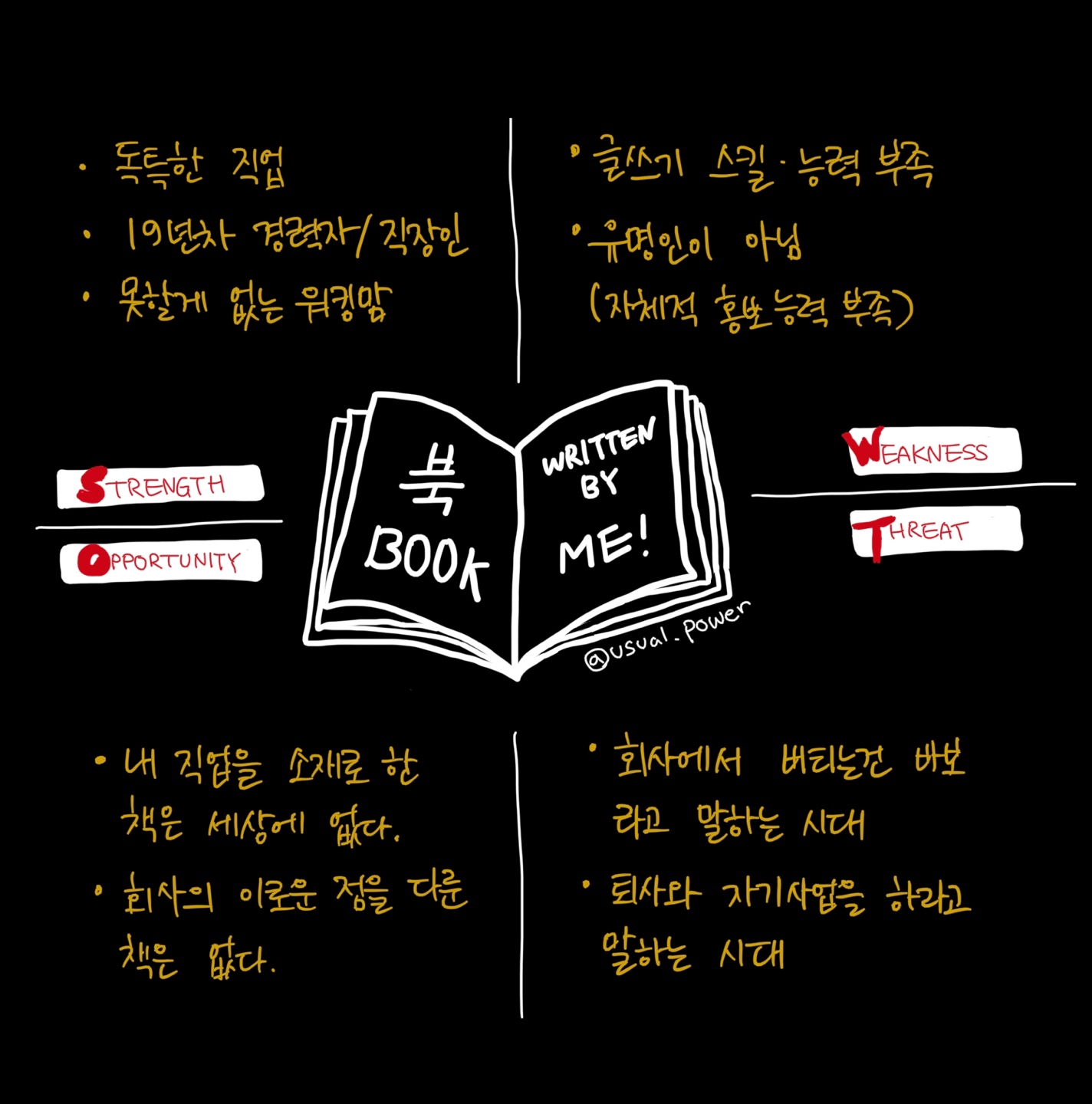 책에서 배운대로 내가 쓰고자하는 책의 SWOT 분석을 해보았다.