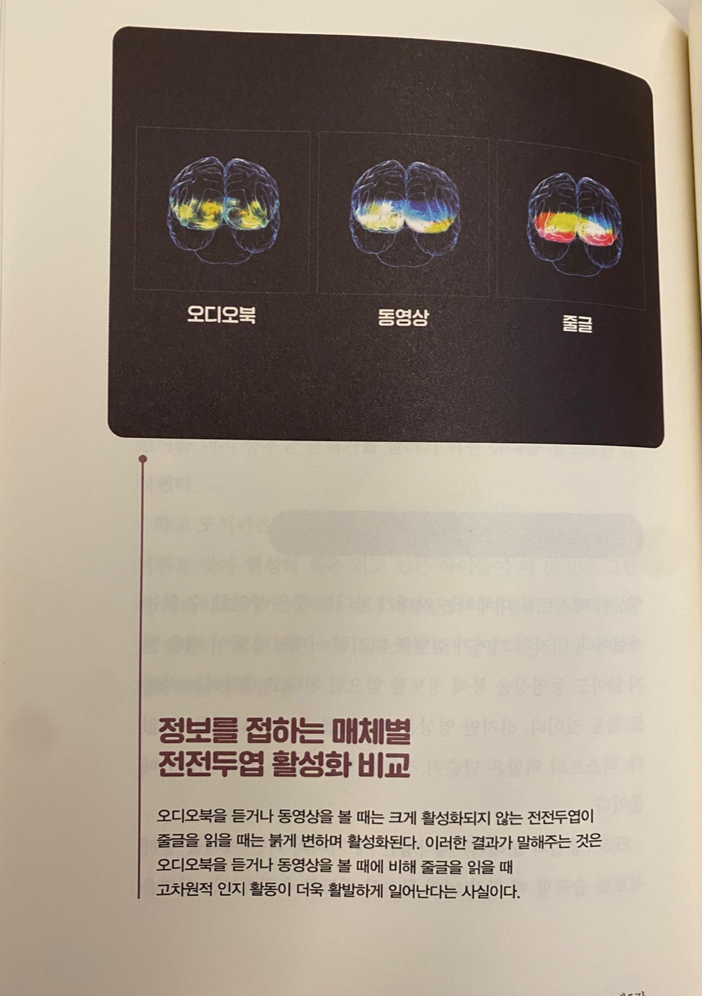 뇌의 영역에서 읽기와 해독 능력과 밀접한 관련이 있는 부위는 전두엽의 앞부분인 <전전두엽>이다. 전전두엽은 추론하고 결정하고 계획하고 집행하고 통제하는 능력을 담당하고, 감정을 조절하는 역할도 한다. 전전두엽은 글을 읽을 때 활성화된다! 그리고, 이는 후천적 노력으로 만들어진다고 한다.
