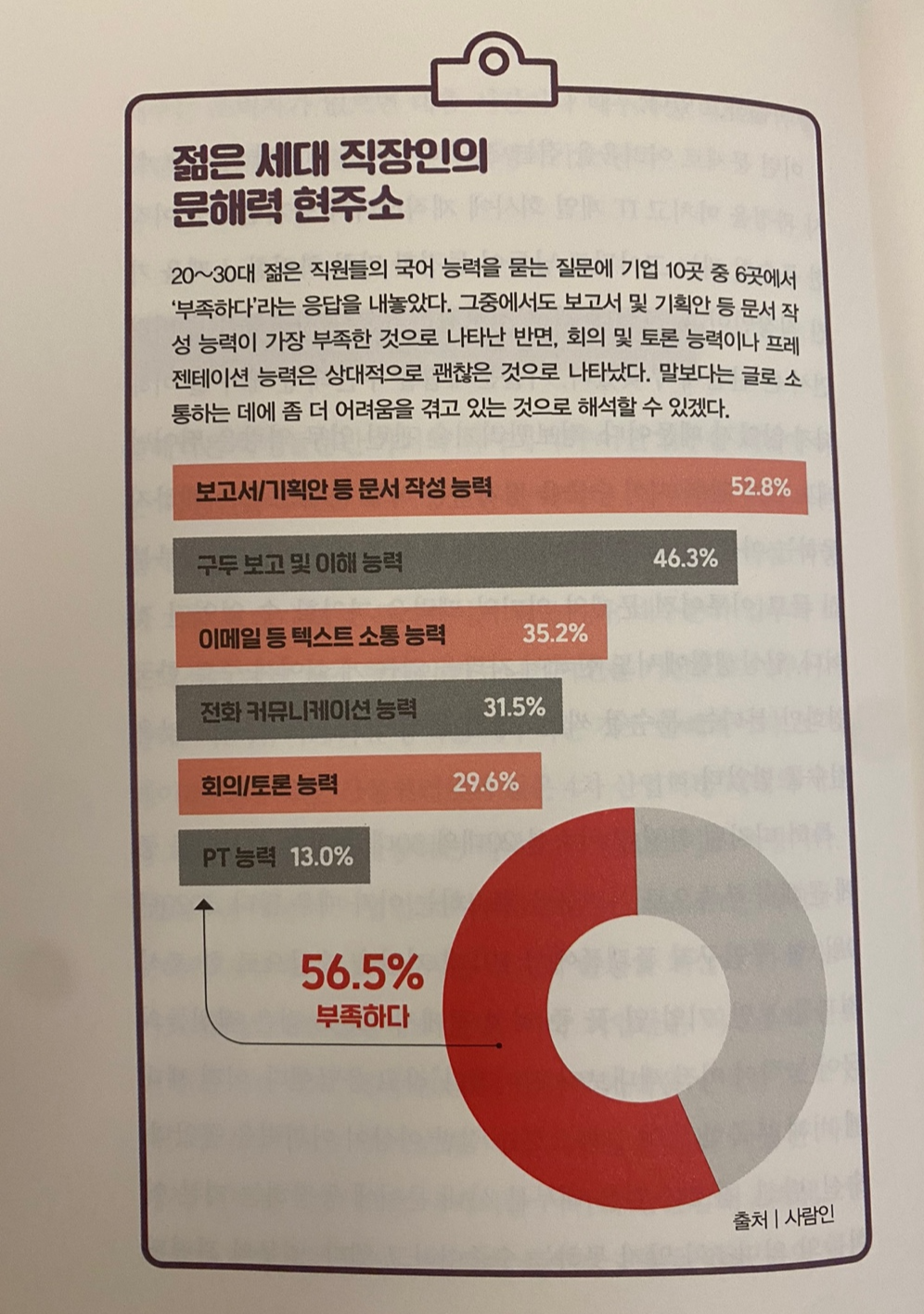 디지털 환경에 익숙한 20대와 30대의 젊은 직장인들 중에 문해력 부족으로 어려움을 호소하는 이가 많다. 2020년 조사 결과에 따르면, 16곳중 6곳에서 2030 젋은 직원들의 국어 능력이 이전 세대보다 떨어진다고 응답했다고 한다.