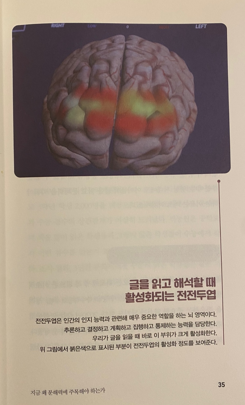 뇌의 영역에서 읽기와 해독 능력과 밀접한 관련이 있는 부위는 전두엽의 앞부분인 <전전두엽>이다. 전전두엽은 추론하고 결정하고 계획하고 집행하고 통제하는 능력을 담당하고, 감정을 조절하는 역할도 한다. 전전두엽은 글을 읽을 때 활성화된다! 그리고, 이는 후천적 노력으로 만들어진다고 한다.